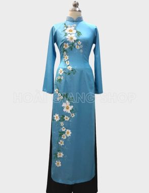 Áo dài nữ xanh vẽ hoa cúc đại đóa