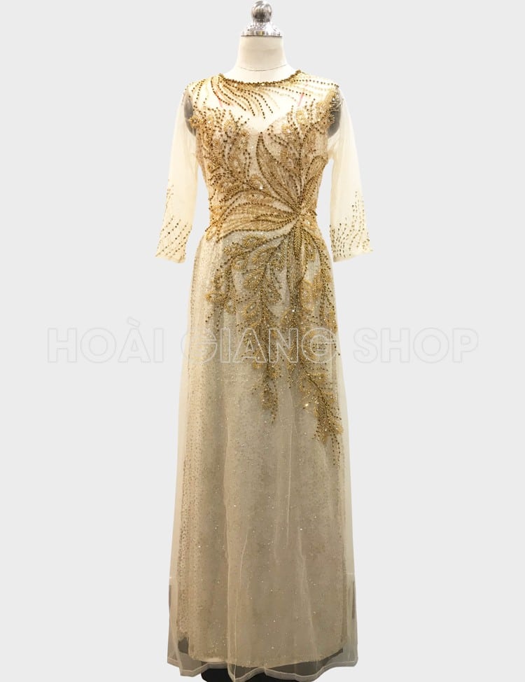 “Tươi trẻ, nhẹ nhàng và sang trọng” đó là 3 tính từ dùng mô tả cho mẫu áo dài ngồi sui màu kem kết pha lê. Bố trí họa tiết lệch 1 bên giúp thanh tú và thon gọn. Bên trong là lớp vải kim sa tạo thêm độ tương phản cho chiếc áo. Các bà sui thích sự trẻ trung có thể lựa chọn mẫu áo dài này.
