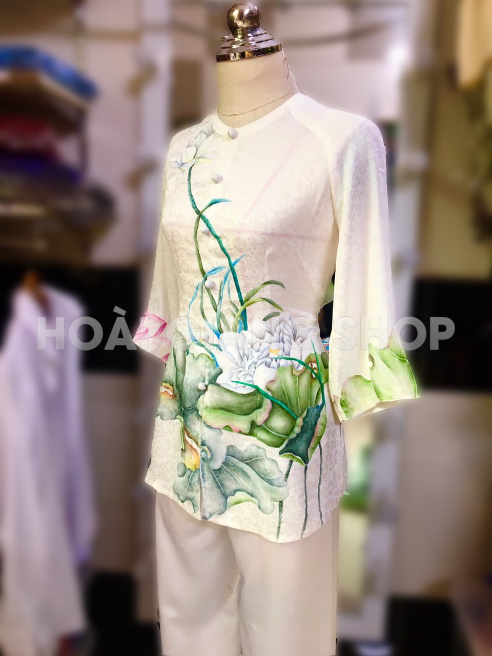 Bà ba nữ gấm trắng tay loe vẽ hoa sen