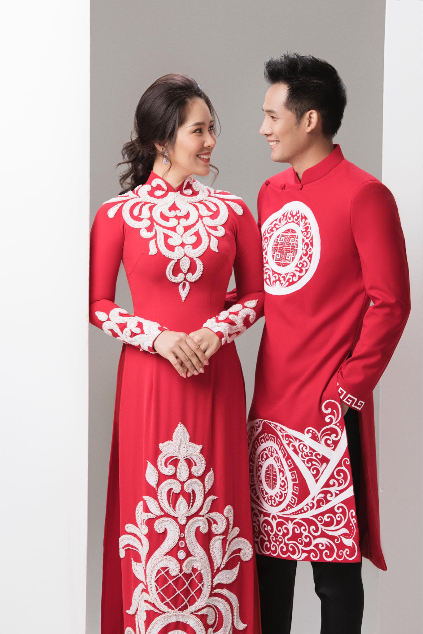 Áo dài cô dâu chú rể màu đỏ vân trắng