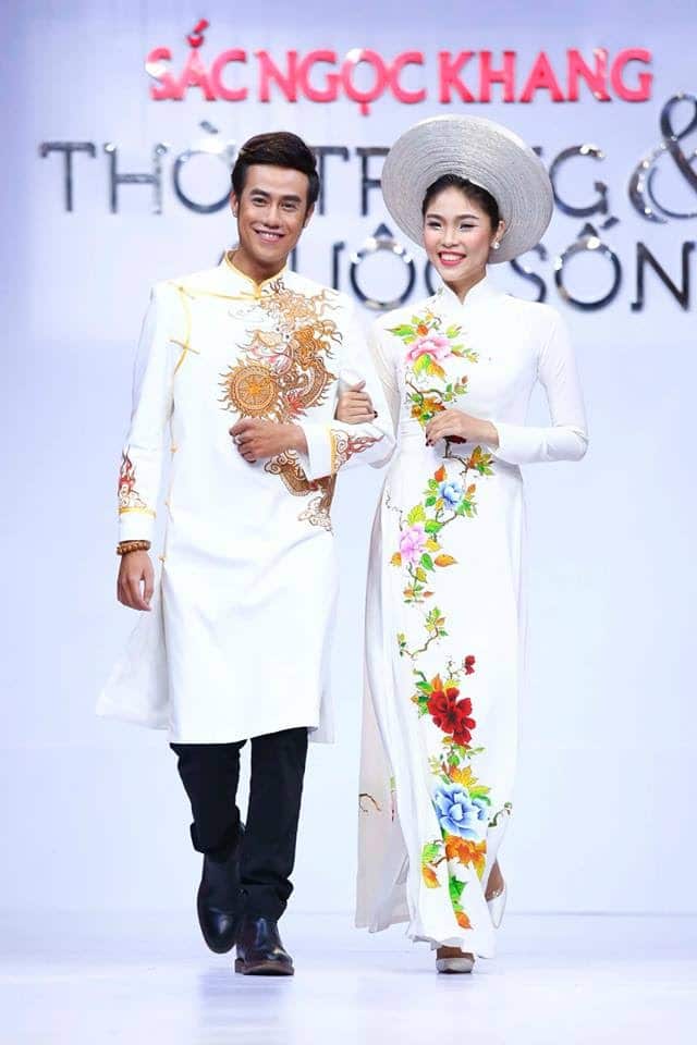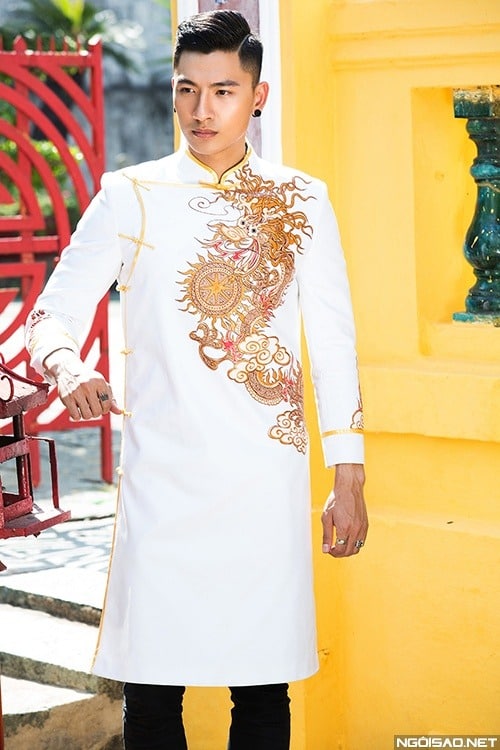 Áo dài nam cách điệu màu trắng vẽ rồng