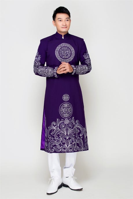 Áo dài nam tím trẻ trung với họa tiết truyền thống