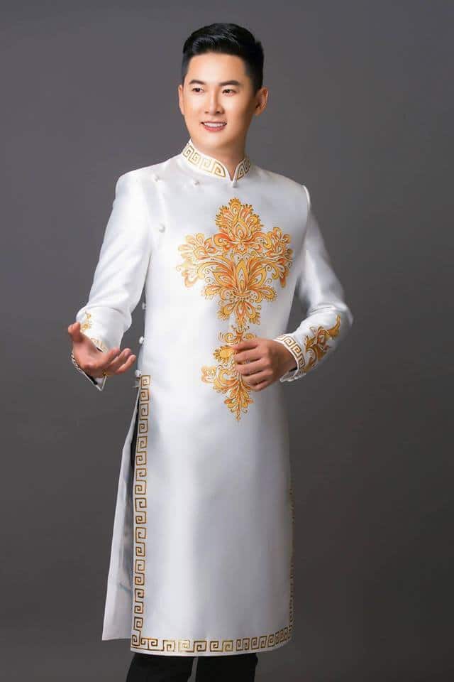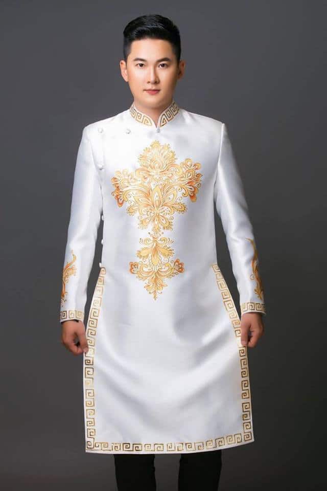 Áo dài nam trắng họa tiết vàng hiện đại