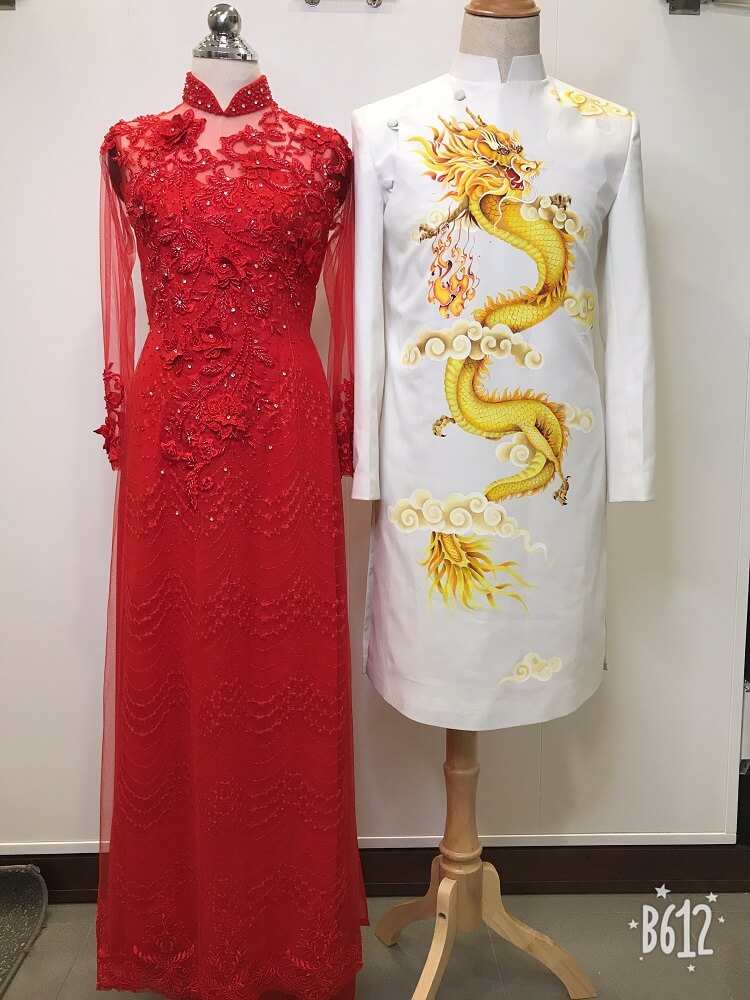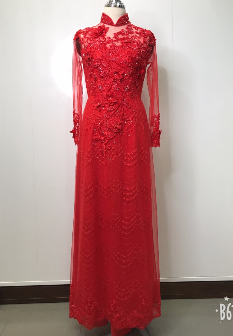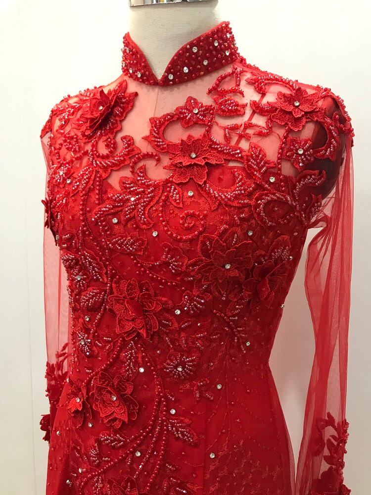 Áo dài cô dâu đỏ kết ren và cườm màu đỏ