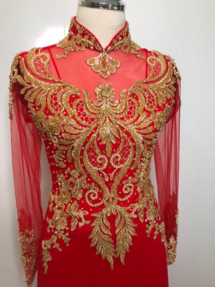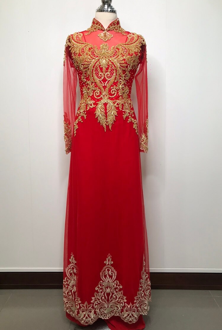 Áo dài cưới cô dâu đỏ kết cườm vàng đồng