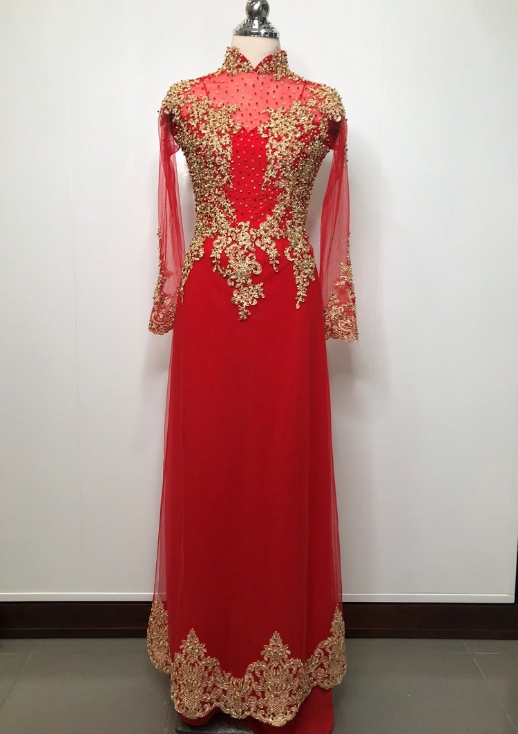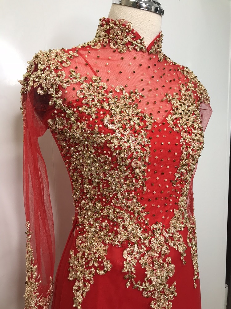 Áo dài cưới cô dâu màu đỏ kết cườm 2 bên