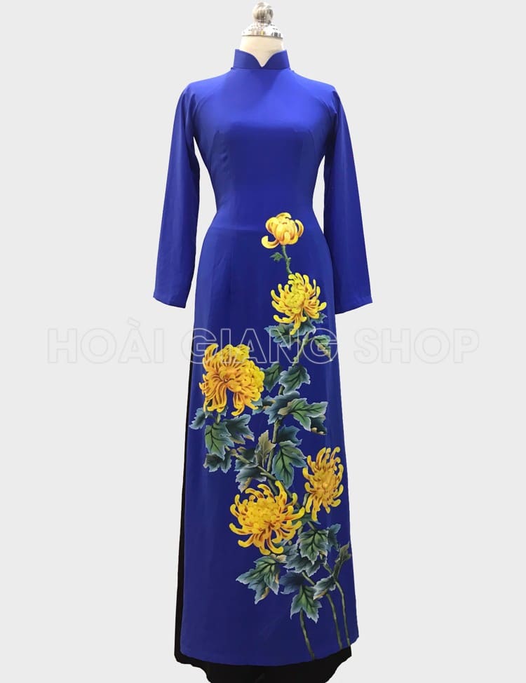 Áo dài nữ xanh vẽ hoa cúc đại đóa