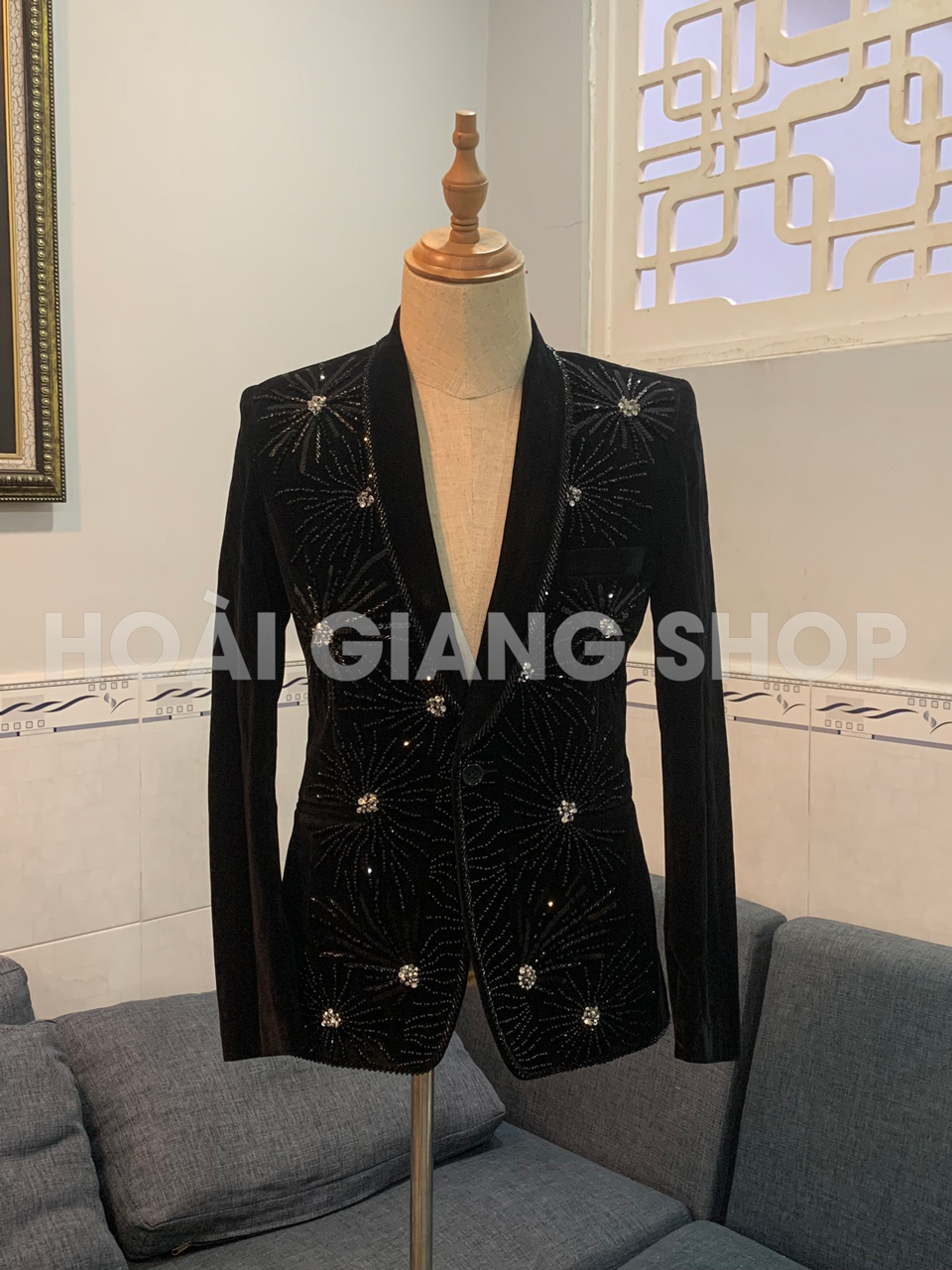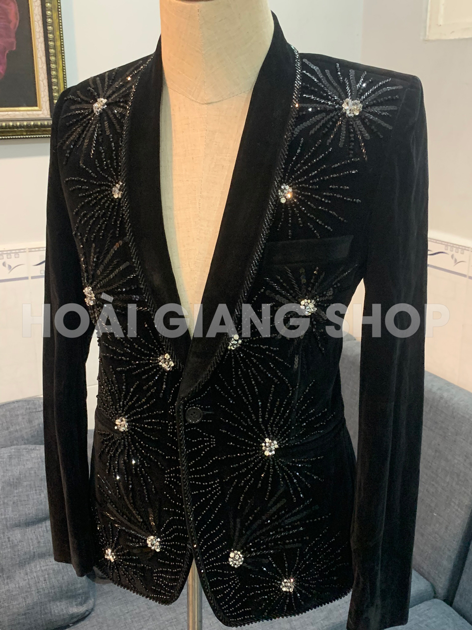 Áo vest nam nhung đen kết cườm