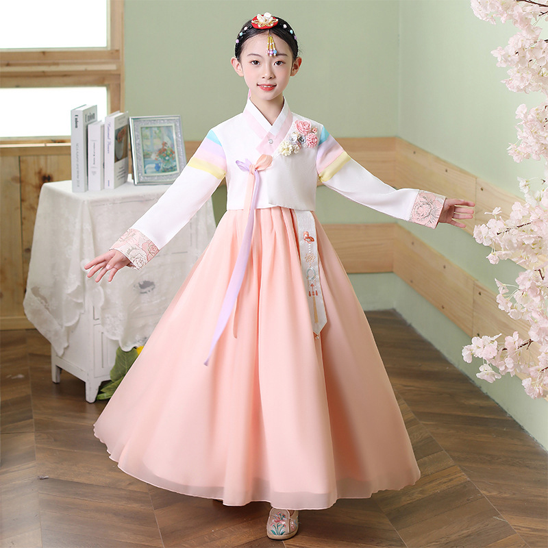 Hanbok bé gái dài tay nhiều màu kết hoa