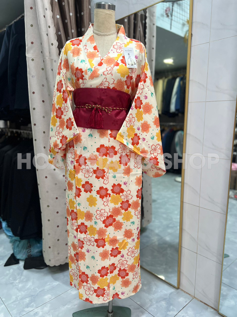 Yukata Nhật Bản hoa đỏ cam